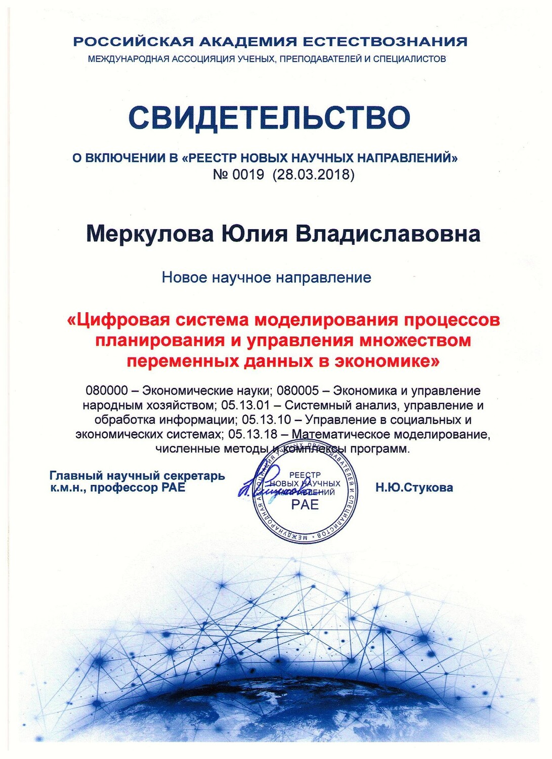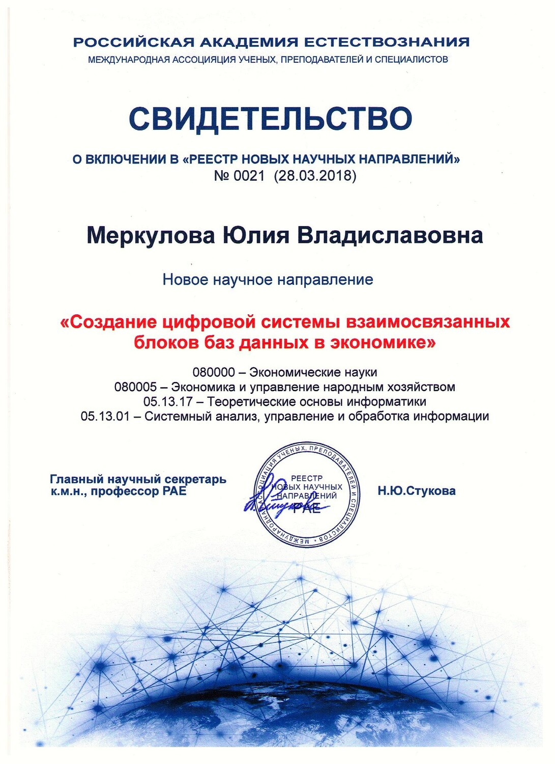 Merkulova Yu.V. created a new scientific school, as it opened and registered four new scientific directions, which are included in the «Register of New Scientific Directions», namely the following: