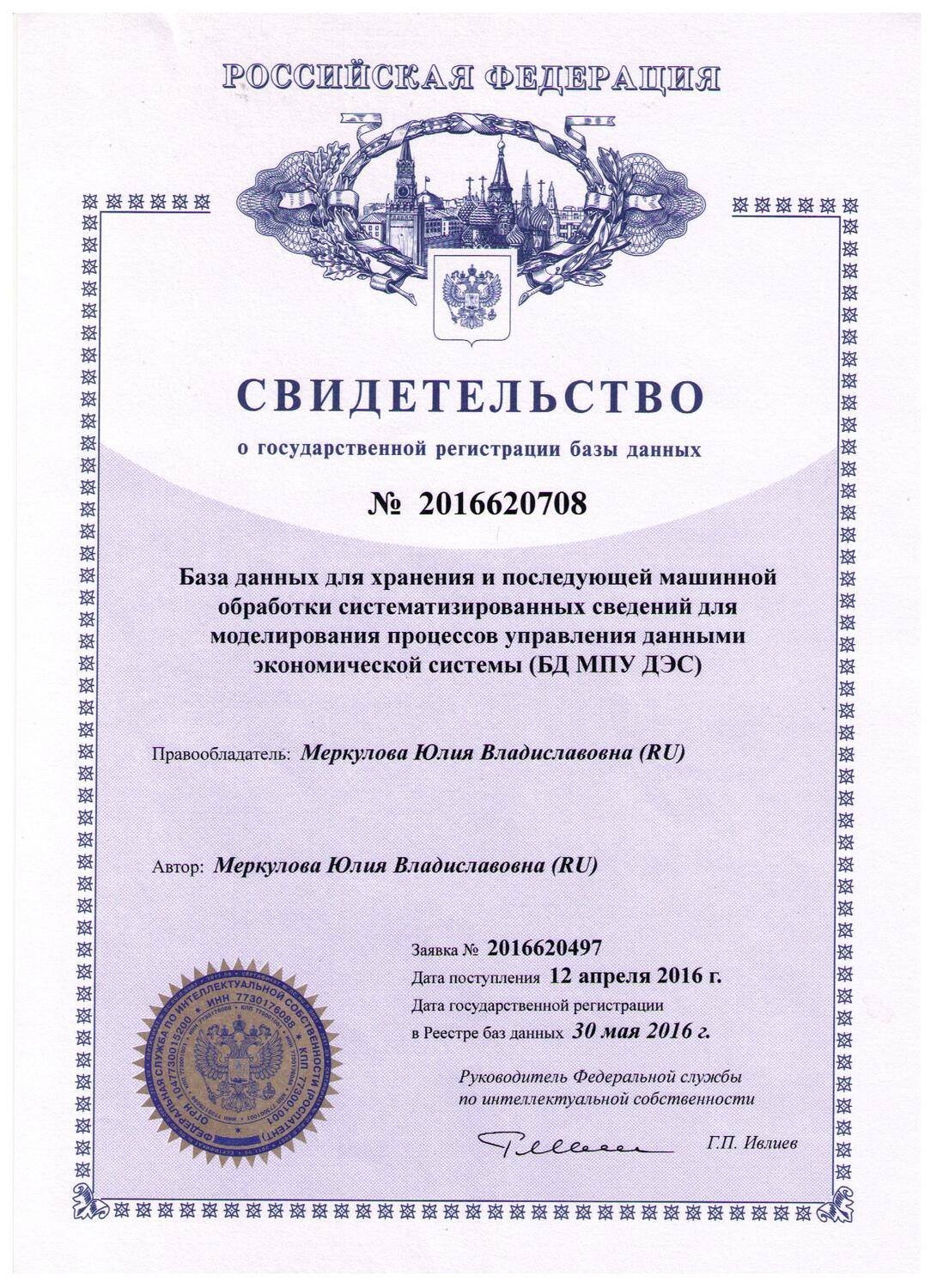 on state registration in the Register of Databases Database for storage and subsequent machine processing of systematized information for modeling of data management processes of the economic system." Author, copyright holder Yu.V. Merkulova