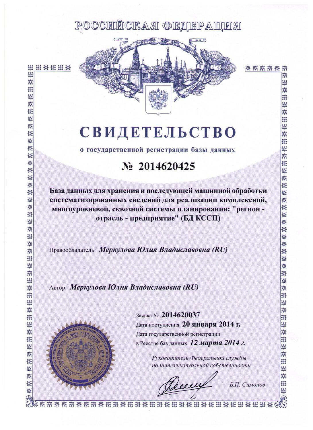 Merkulova Yu.V. is the author and copyright holder of three databases that have received state registration of FIPS, about which there are records of state registration in the Register of Databases dated March 12, 2014, certificate No. 2014620425; dated October 16, 2014, certificate No. 2014621457; dated May 30, 2016, certificate No. 20166207