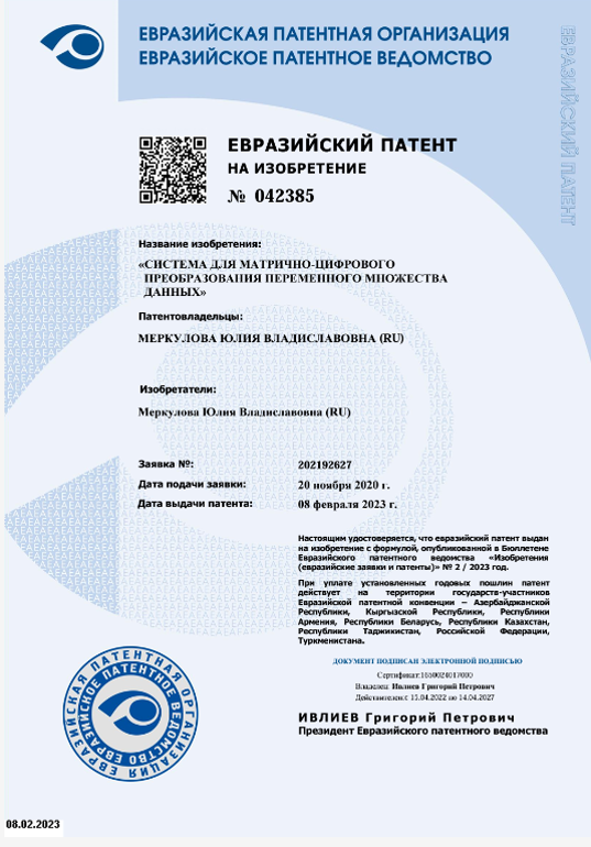 Merkulova Yu.V. - the author of the idea and developer of the theory of transformation of big data in economics, since she is an inventor in this field, namely the sole inventor and patent holder of Russian patent N 2752911 «System for implementing a way of matrix-digital transformation of a variable plurality of data for generating a situational-strategic program of the offer of products» and Eurasian patent № 042385 «System for matrix-digital transformation of a variable plurality of data» , and she is also the author of the scientific monograph «Technical Inventions in Economics» and many other scientific works and monographs.